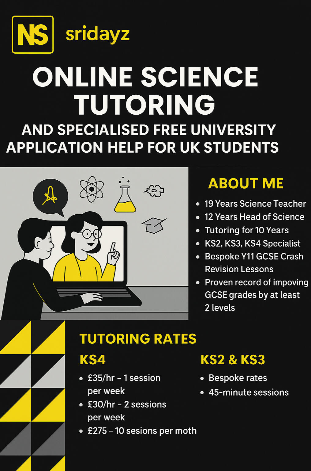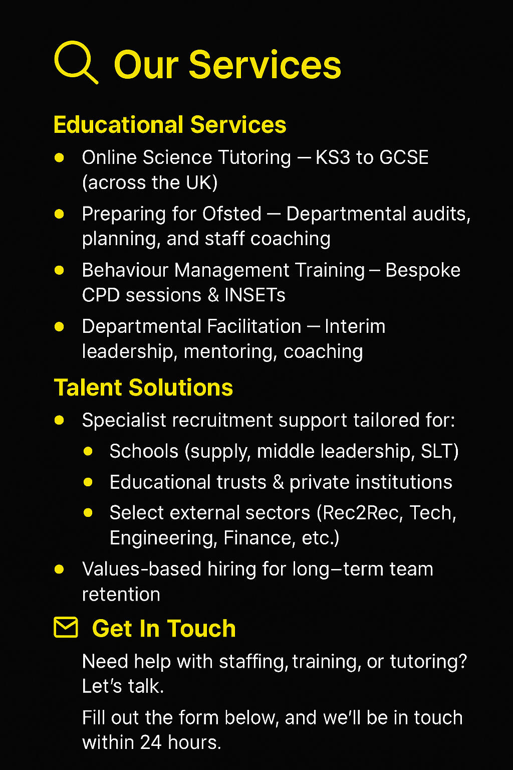 See section below on out Talent Hiring Solution services.👨🏫 Online Science Tutoring Across the UKLooking for expert science tutoring from the comfort of your home?Please fill in the form below and SUBMIT or contact me directly on email or contact number provided.I offer online KS3 and GCSE science tuition for students across the UK — specialising in Biology, Chemistry, and Physics. Whether your child needs help preparing for exams or catching up in class, I tailor every session to suit their learning needs.My Science teaching experience of over 19 Years, with a proven track record of raising levels and grades can be backed up by testimonials as seen below.
