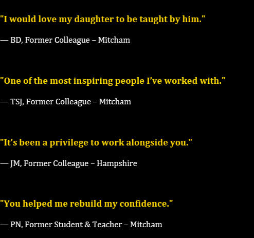 📘 Part 4: The Classroom Years - Bruce Lee and Kung Fu Gave me the Inner ConfidenceMy first teaching job was in Colchester, serving a school that was notoriously challenging and serving the largest estate in the UK at one point. What a baptism of fire that was. Loved every minute of it. I realised that I was made for the classroom.I concentrated more on teaching Science as that was very much a subject in demand and I very quickly loved studying the psychology and sociology of students. Their dynamics, interactions, what made them tick and in some cases not tick, the root of behavioural issues.What I found out very quickly was how the students loved to hear about my background, my story and responded to real life applications.I carried this forward over many years, fine tuning my art and relishing working with students who were deemed as "lost causes", across Brixton and Brent.In 2003, I obtained my First Head of department role in Luton. An incredible steep learning curve in learning to manage a defragmented team of teachers and Science technicians.This is where all my experiences in the footballing world came into play. Resolution conflicts. Over the subsequent Years to follow, I worked in other head of Department roles in schools that were deemed to be "inadequate" , Science departments deemed to be "failing" , putting into place action plans for improvement and getting the schools through "OFSTED". I seemed to be getting a name for myself and having completed a stint in Tottenham, I was "headhunted" to lead a team at a school in Mitcham.A school that had been tarnished on many occasions by "poor behaviour" that they had to endure many name changes. Police community officers at the gate. The Science Department was deemed "as Failing substantially" - Students were actually offered the Subject as an option as opposed to the fact it was compulsory. What followed was everything I had learnt on the football pitches of Haringey and Hackney, through the previous schools I had worked at, all coming together over a 5 Year improvement plan. To sum it up, GCSE Science was no longer an option. Every student had to be entered for it from the time I joined in 2012 and most importantly, results increased Year on Year from 7% A-C grades to 95% A-C grades.I look back now with pride the measures I put in place and how a team was built there from part-scratch who shared my vision. The recruitment of the teachers right down to motivating, inspiring and offering multiple pathways for students to succeed. I was awarded 2 "Outstanding Grades|" whilst I was there BUT that wasn’t the end.In 2012, I was "headhunted" again and whilst I was not looking to move, this was a challenge I had to say yes to.A Pupil referral unit in Hampshire. What an amazing experience as Head of Science, being part of an extended Senior Leadership team, the relationships built with staff and probably the most vulnerable and "difficult" in my entire time as a teacher , and seeing these students achieve incredible success against the odds. Prom nights said it all.
